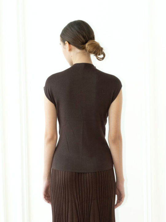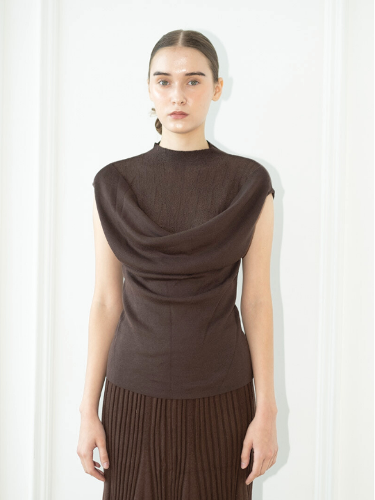 A sleeveless knit top designed with a soft draped front detail that creates a sculptural, layered look. Crafted from lightweight knit fabric, it offers a smooth fit while adding subtle volume and elegance to the silhouette. Perfect for elevating everyday or evening styling.
