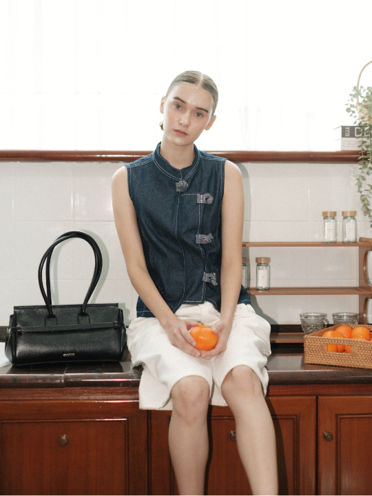 A sleeveless denim top featuring a modified cheongsam-style button closure. Designed with contoured seams that shape and define the waist, enhanced by contrast stitching for a clean, architectural finish. A modern reinterpretation of traditional detailing with a sharp, feminine silhouette.